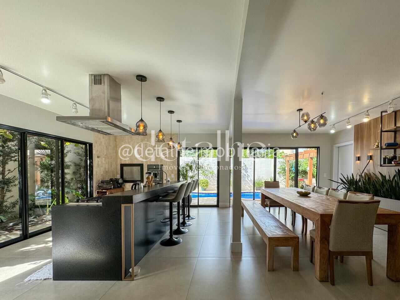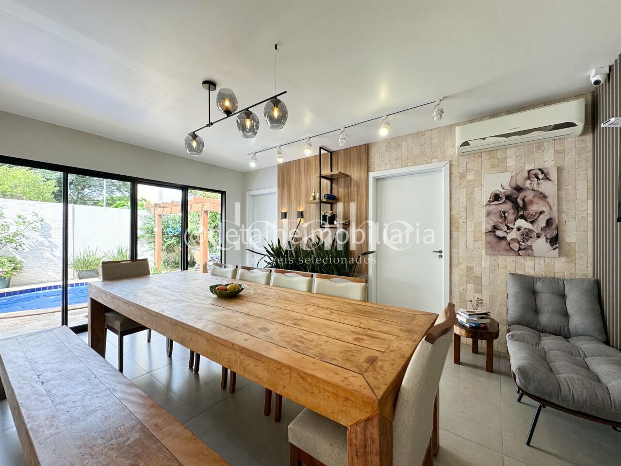 Casa térrea, em condomínio fechado, parcialmente mobiliada, o imóvel conta com móveis planejados, espaço gourmet com churrasqueira a carvão e vista para a piscina.